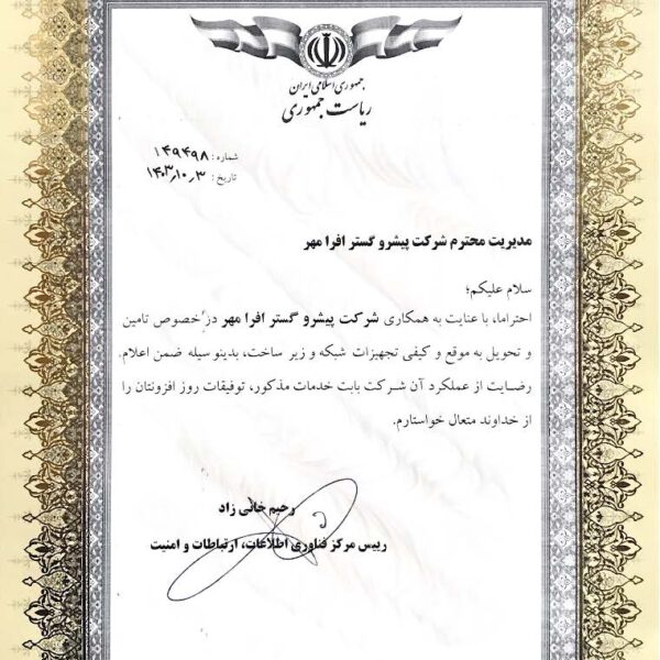 شرکت پیشرو گستر افرا مهر با تأمین و تجهیز تجهیزات شبکه، در پروژهای برای نهاد ریاست جمهوری نقشآفرینی کرده است. این همکاری موفق منجر به دریافت گواهی حسن انجام کار گردید.