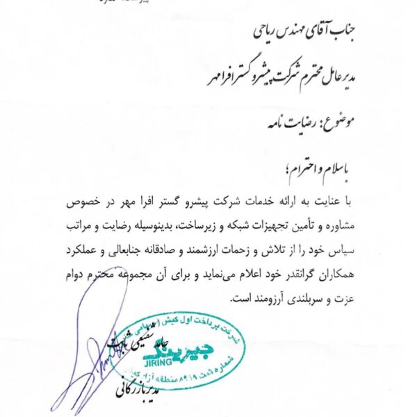 شرکت پیشرو گستر افرا مهر با تأمین و تجهیز تجهیزات شبکه، در پروژهای برای شرکت پرداخت اول کیش (جیرینگ) نقشآفرینی کرده است. این همکاری موفق منجر به دریافت گواهی حسن انجام کار گردید.