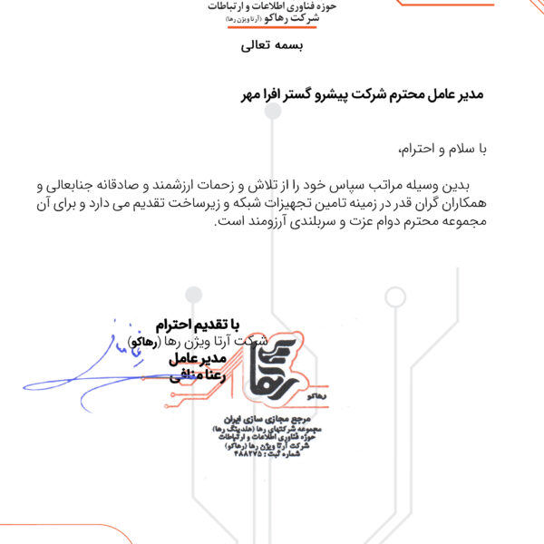شرکت پیشرو گستر افرا مهر با تأمین و تجهیز تجهیزات شبکه، در پروژهای برای هولدینگ رها نقشآفرینی کرده است. این همکاری موفق منجر به دریافت گواهی حسن انجام کار گردید.