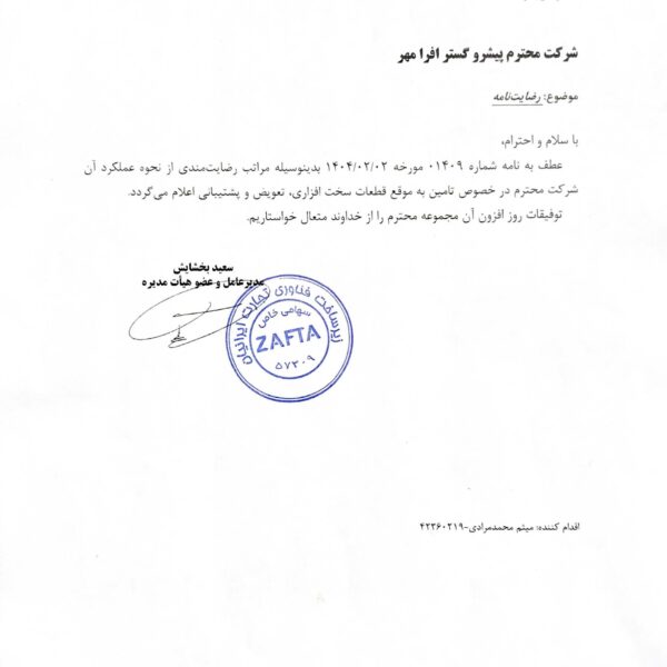 شرکت پیشرو گستر افرا مهر با تأمین و تجهیز تجهیزات شبکه، در پروژهای برای شرکت زیرساخت فناوری تجارت ایرانیان (زفتا) نقشآفرینی کرده است. این همکاری موفق منجر به دریافت گواهی حسن انجام کار گردید.